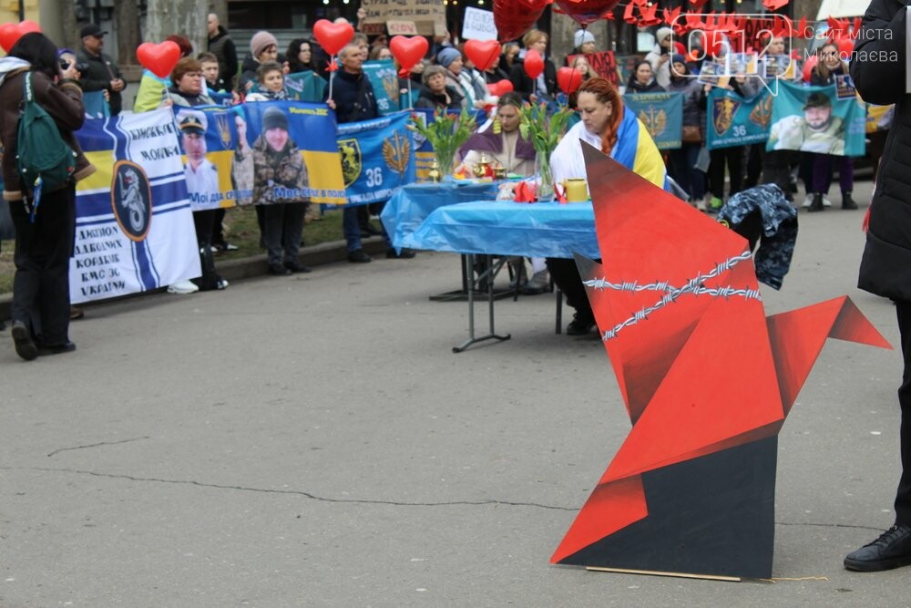 Акція "Два серця в полоні" присвячена тому, що з кожним військовополоненим та безвісті зниклим стоять їх рідні та близькі. Тому, зазначили під час заходу, "у полоні перебуває не одне серце, а два та навіть більше". Дружини, діти, матері представили перформанс про те, що відчуває кожен рідний чекаючи свою близьку людину.