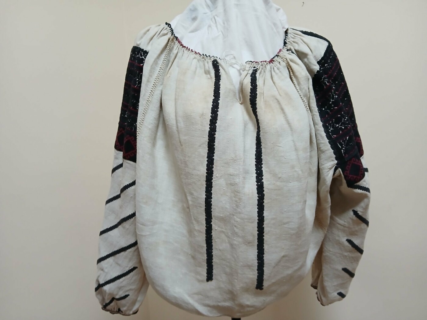 Этот экземпляр изготовлен из домотканого конопляного полотна, а плотная вышивка черными и вишневыми нитями придает ткани объемную текстуру — такой орнамент поражает даже опытных этнографов.