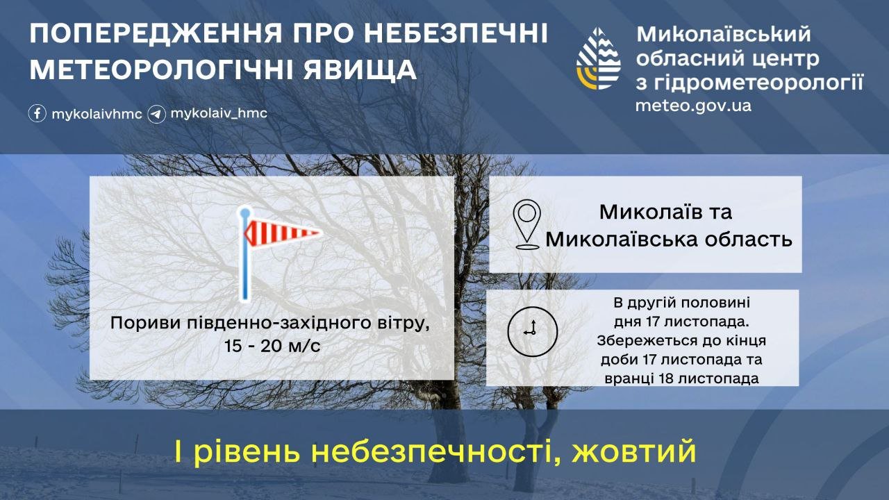Во второй половине дня, 17 ноября, на территории Николаевской области ожидается значительное усиление ветра. Об этом сообщает Николаевский областной центр по гидрометеорологии.