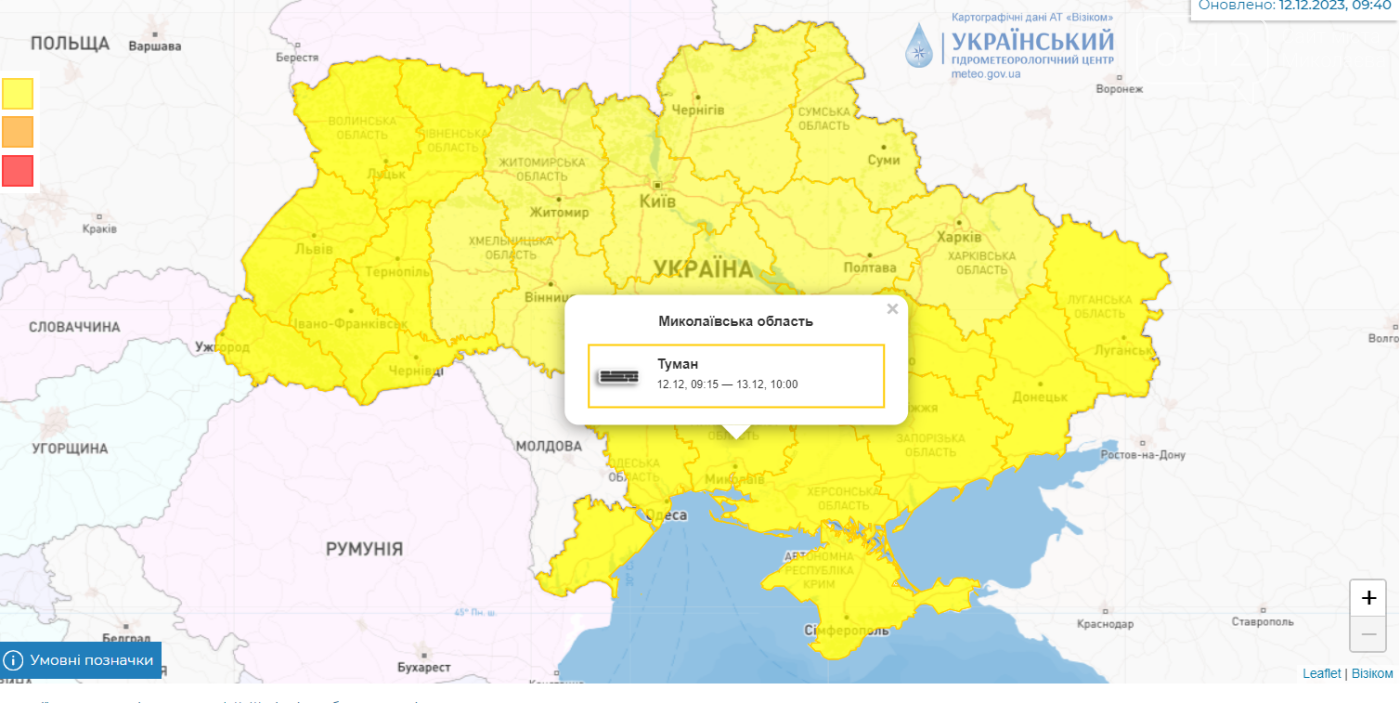 13 грудня вночі та вранці 13 грудня в Україні туман, видимість 200-500м (I рівень небезпечності, жовтий).