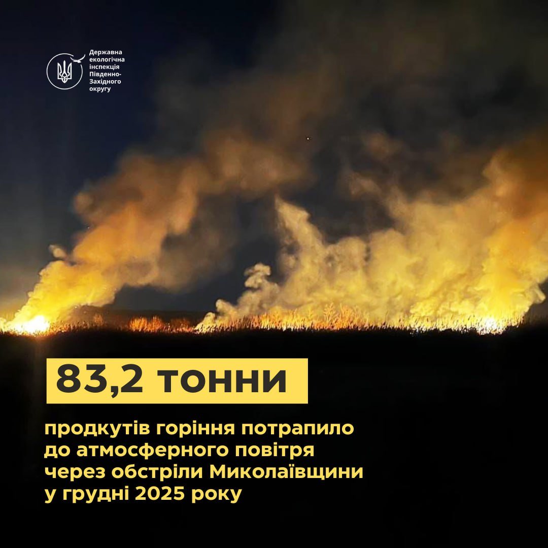 В течение декабря 2025 года в Николаевской области зафиксировали масштабное загрязнение воздуха из-за пожаров, вызванных российскими обстрелами. Общая сумма экологического ущерба превысила 253 тысяч гривен. Об этом сообщили в Государственной экологической инспекции Юго-Западного округа.