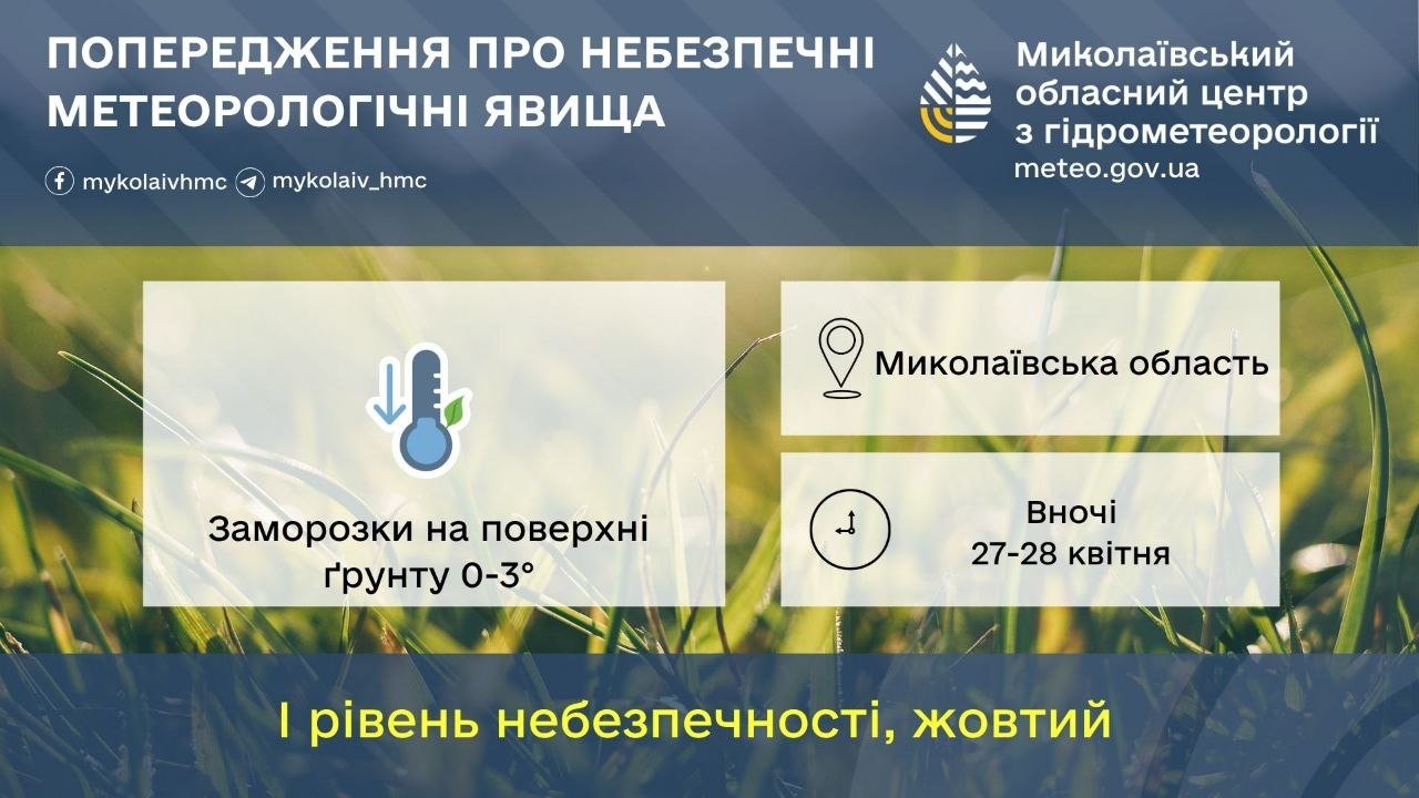 С понедельника, 27 апреля, в Николаевской области ожидаются заморозки на поверхности почвы. Синоптики объявили І уровень опасности. Об этом сообщает Николаевский областной центр по гидрометеорологии.