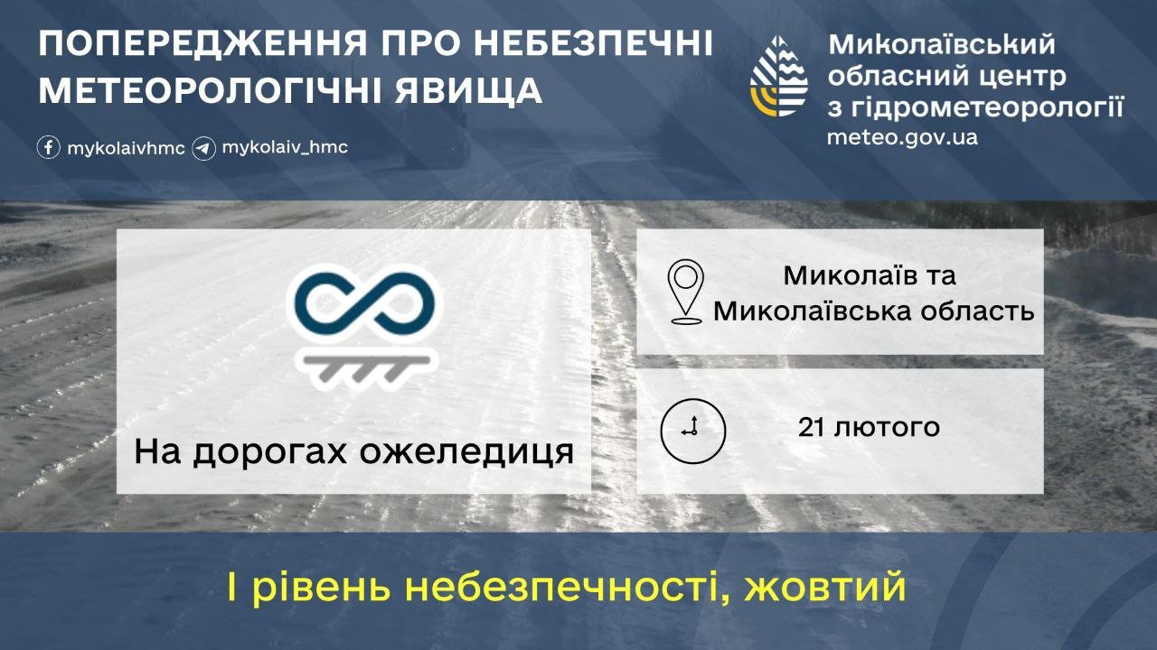 21 февраля на территории Николаевской области сохранится гололедица на дорогах. Синоптики объявили І уровень опасности — желтый. Об этом сообщает Николаевский областной центр по гидрометеорологии.