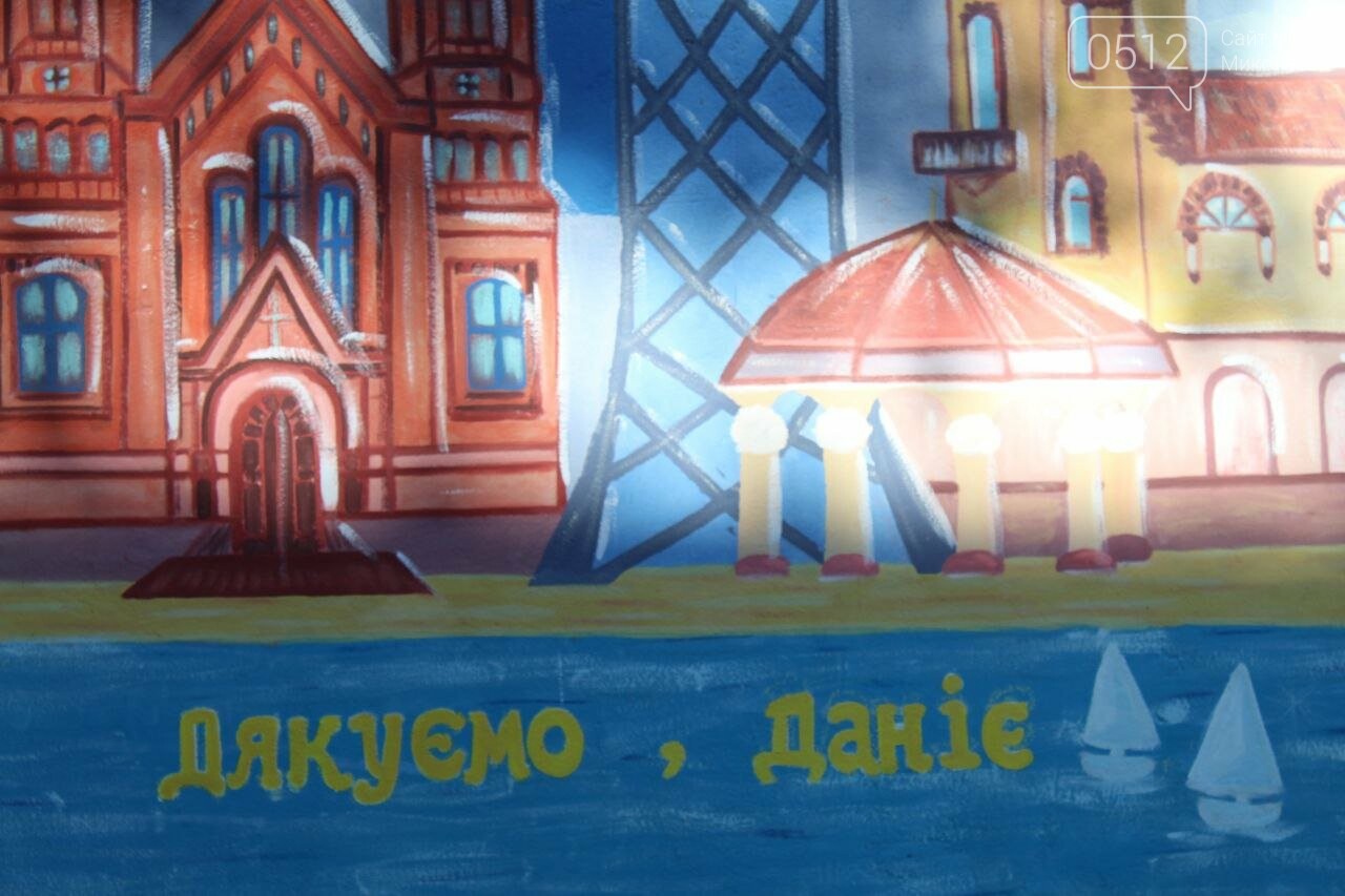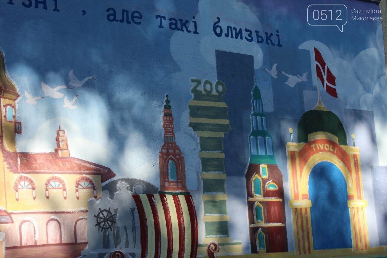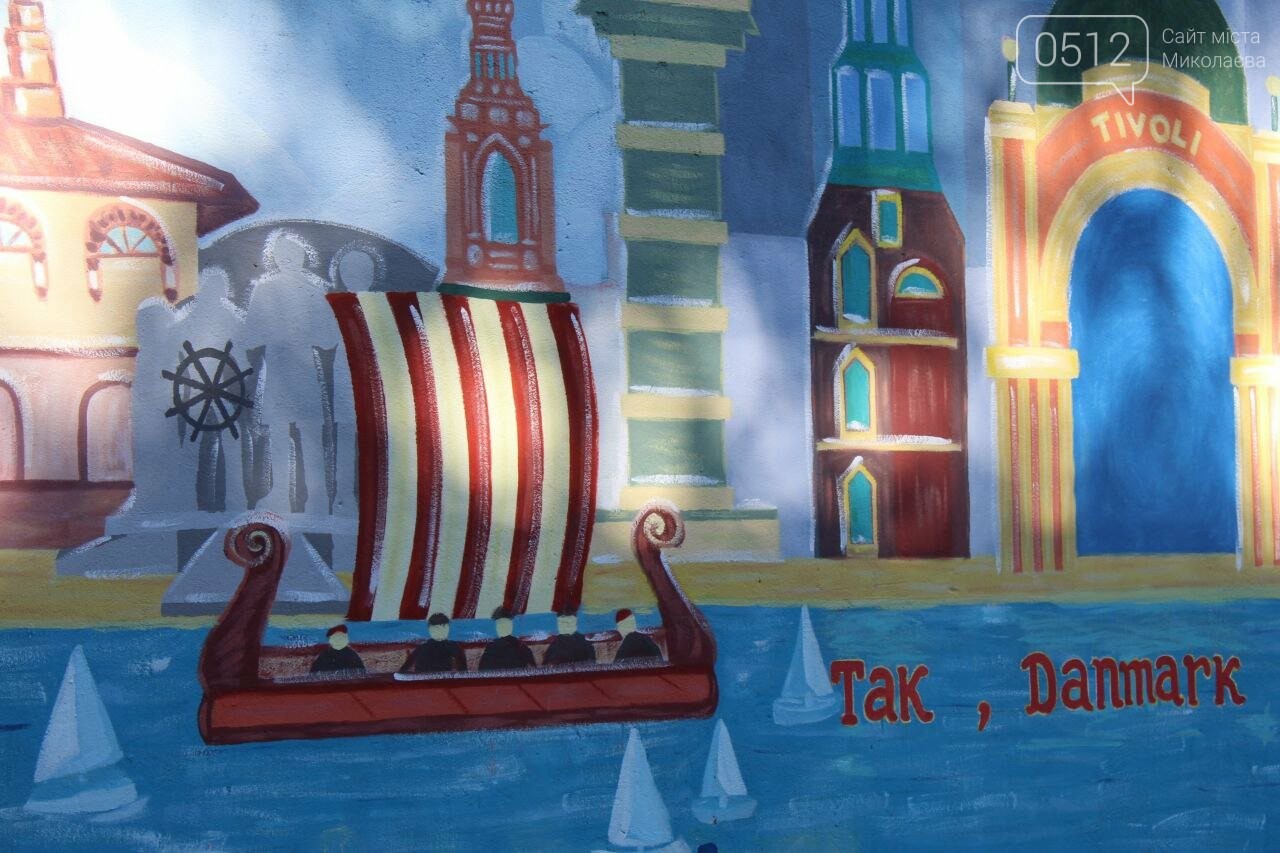 Как сообщает корреспондент 0512, теперь на стене здания Николаевского академического художественного драматического театра изображены некоторые объекты города и слова благодарности народу Дании.