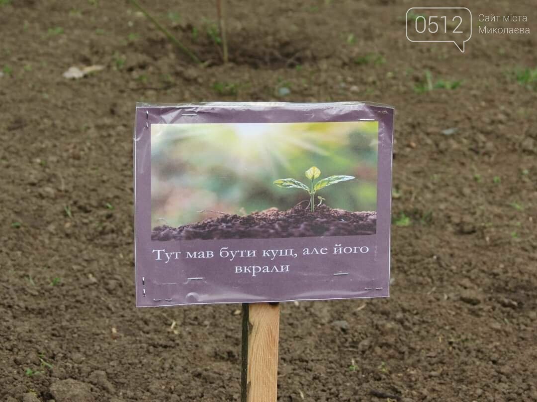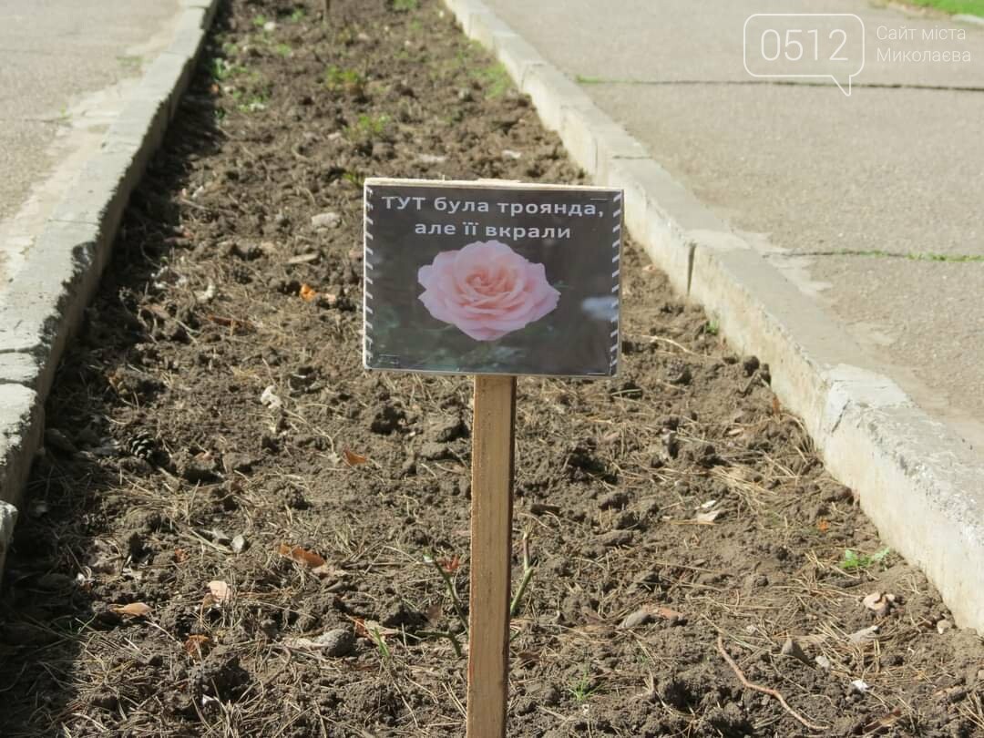 У КП "Миколаївські парки" пишуть, що тому, на місцях, де вкрали квіти, поставили спеціальні таблички, аби люди знали,чому саме на цій клумбі відсутні квіти чи кущі.