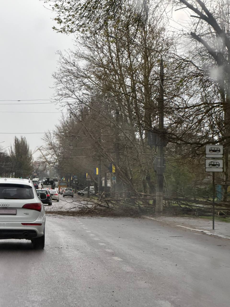 16:08 Позже «Николаевэлектротранс» сообщил, что также в результате падения дерева по ул. Лазурной произошло повреждение контактной сети. Поэтому наблюдаются временные осложнения в работе троллейбусного движения.