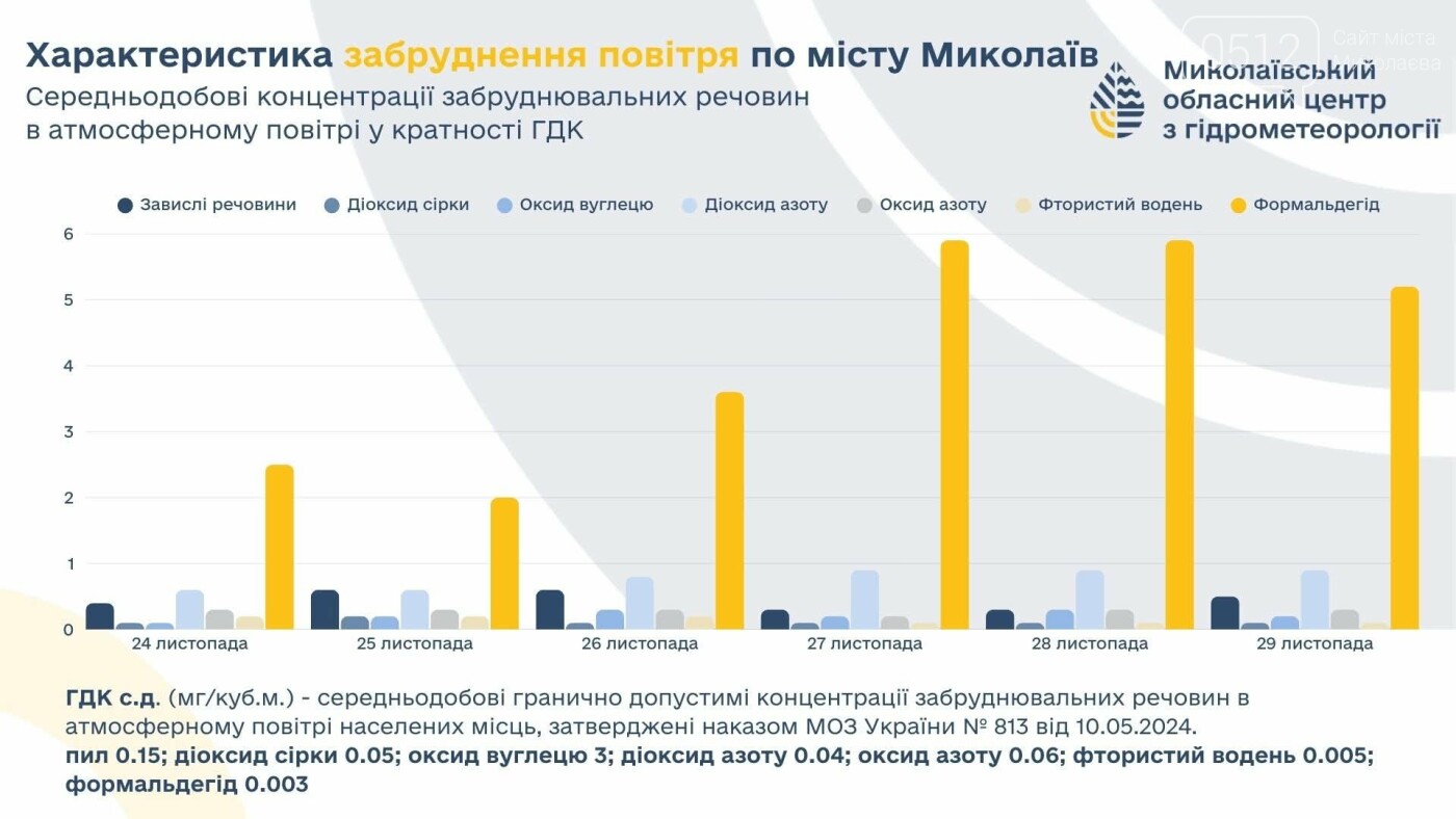 За период 24-29 ноября 2025 года в Николаеве отмечено стабильное превышение среднесуточной предельно допустимой концентрации формальдегида .