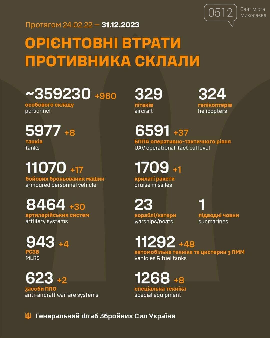 За минулу добу, 30 грудня, українські захисники ліквідували 960 російських агресорів. Крім того, наші воїни знищили і ряд ворожої техніки, зокрема 30 артсистем.