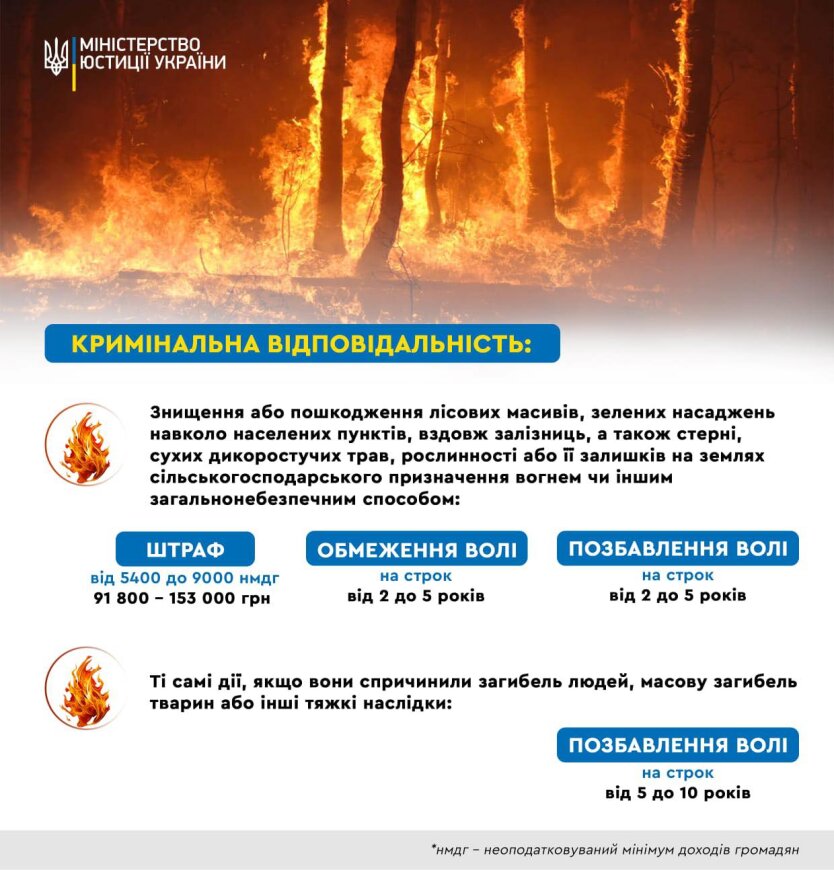 Кроме того, за уничтожение или повреждение лесных массивов, зеленых насаждений вокруг населенных пунктов, вдоль железных дорог, а также стерни, сухих дикорастущих трав, растительности на землях сельскохозяйственного назначения огнем или иным общеопасным способом предусмотрен штраф от 91 800 до 153 000 гривен, или лишение свободы сроком от 2 до 5 лет.